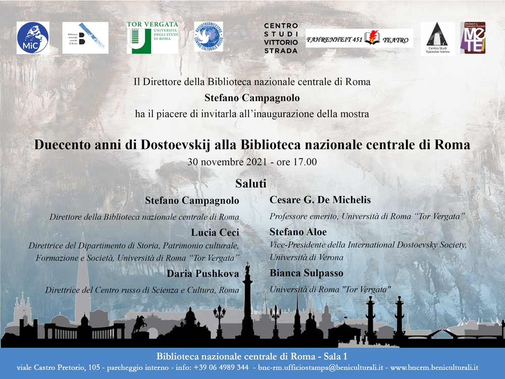 Il progetto, nato in collaborazione con la Biblioteca nazionale centrale di Roma e curato da Bianca Sulpasso e Stefano Aloe, ricostruisce alcune tappe significative della ricezione di Dostoevskij in Europa e in Italia, attraverso i fondi librari e manoscritti della Biblioteca nazionale centrale di Roma. Dall’ingresso in Europa al Dostoevskij ‘francese’ che tanto influì, in prima battuta, su quello ‘italiano’, dal tentativo ‘fallito’ di celebrare Dostoevskij in occasione del suo centenario, al Dostoevskij ‘scrittore ameno’. Un’attenzione specifica è poi dedicata alla ricezione di Dostoevskij in Italia: i primi lavori di slavistica, il rapporto con gli scrittori italiani, il ruolo centrale giocato dagli emigrati russi in Italia nella resa traduttiva dall’originale testo russo e, infine, il riversarsi di Dostoevskij e dei protagonisti dei suoi romanzi sulle scene teatrali, sulle pellicole cinematografiche, nei libretti d’opera.