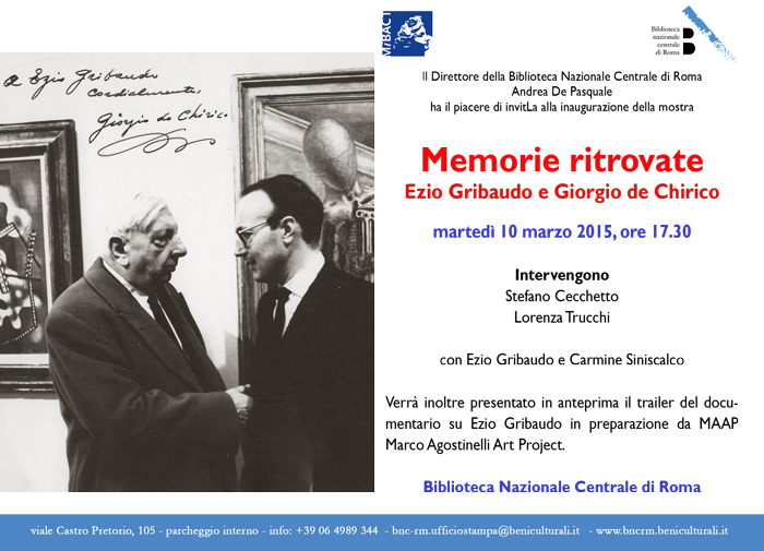 A partire dalla presentazione di un volume appena edito da Skira, che ripercorre in un racconto per immagini la lunga amicizia tra Giorgio De Chirico e l'artista ed editore d'arte Ezio Gribaudo, artefice della sua riscoperta negli anni '70, nasce l'esposizione Memorie ritrovate. Ezio Gribaudo e Giorgio de Chirico (lun-ven 10-19, sab 10-13, ingresso gratuito, dal 10 marzo al 10 aprile 2015), con cui la Biblioteca Nazionale Centrale di Roma rende omaggio a questo fruttuoso sodalizio attraverso una selezione di disegni originali di De Chirico dal 1923 al 1957, esposti per la prima volta a Roma, una sua lettera manoscritta e una serie di Omaggi a De Chirico eseguiti da Gribaudo nel 1968 e mai più esposti dagli anni '70, che ripropongono, prima di Andy Wahrol, i temi del pittore della Metafisica attraverso la serialità iconica della pop art. L'allestimento ripercorre così gli episodi salienti degli incontri tra i due artisti, la memoria e i luoghi della Metafisica nella Torino degli anni '70, che vede i due protagonisti riuniti sotto la lapide in memoria di Nietzsche, quasi a testimoniare un'affermazione di paternità; Gribaudo a Roma ospite di de Chirico per la preparazione della monografia Fabbri e poi de Chirico a Parigi per il vernissage della mostra di Ezio Gribaudo alla Galerie de France; le tappe della loro collaborazione professionale per tre importanti pubblicazioni che portarono a una ripresa dell'interesse per de Chirico, contribuendo a superare una lunga fase di stasi della sua presenza nel canone artistico italiano moderno: 194 disegni di de Chirico (Edizioni d'Arte Fratelli Pozzo, 1968), la monografia Giorgio de Chirico, curata dalla moglie dell'artista, Isabella Far (Fabbri Editori, 1968) e De Chirico com'è, sempre per i tipi della Pozzo nel 1970.