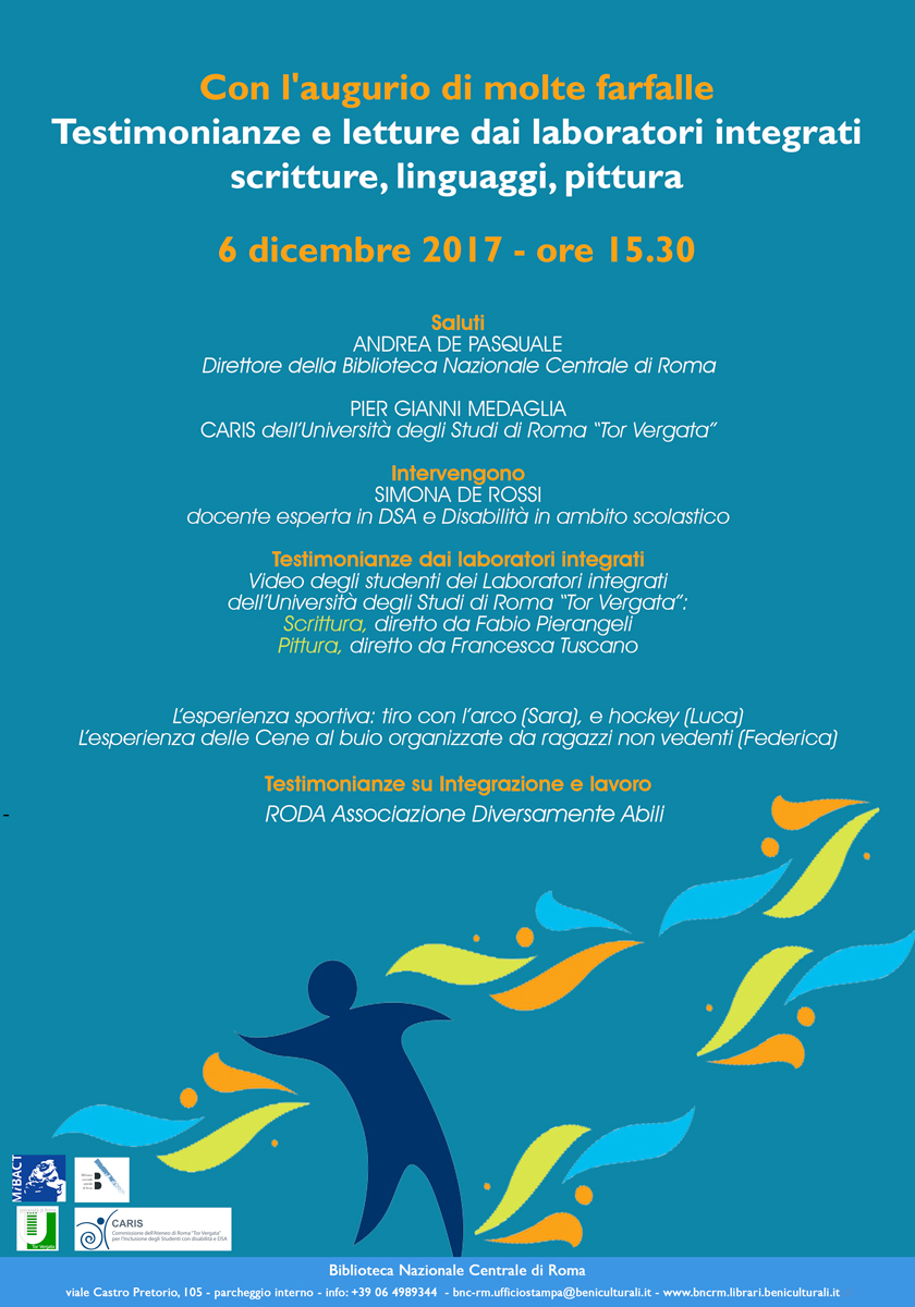 Dopo i saluti del Direttore della Biblioteca Nazionale Centrale di Roma Andrea De Pasquale l’evento vedrà un confronto tra scuola e università sul tema della disabilità e DSA con la docente Simona De Rossi e Gianni Medaglia, Presidente della CARIS dell'Ateneo di Tor Vergata (Commissione per l'integrazione della disabilità e DSA).