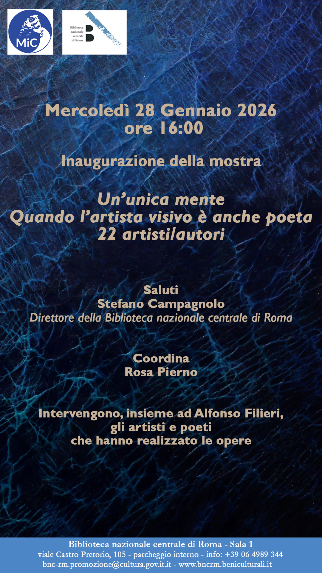 La Biblioteca nazionale centrale di Roma inaugura il 28 gennaio 2026 la mostra Un’unica mente. Quando l’artista visivo è anche poeta: 22 artisti/autori, che espone ventidue libri d’artista realizzati, per il progetto curato da Rosa Pierno Un’unica mente, dalle edizioni Orolontano di Alfonso Filieri.